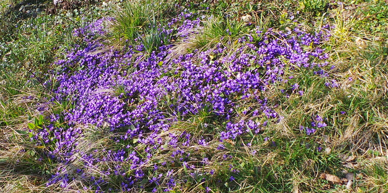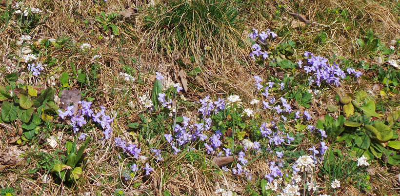 In primavera nei prati crescono le primule, violette dalle diverse tonalità di colore e altri fiori.