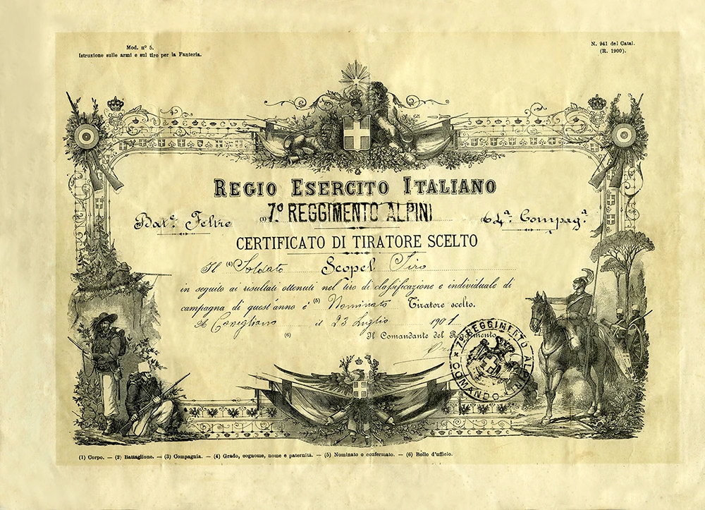 Siro Scopel detto “Taramot”, il soprannome si è poi esteso ai suoi discendenti chiamati Scopei Taramot chiamato al servizio militare a Conegliano nel 1901. Si dimostrò particolarmente abile nel tiro da ottenere il certificato di tiratore scelto del Regio Esercito Italiano, 23 luglio 1901.